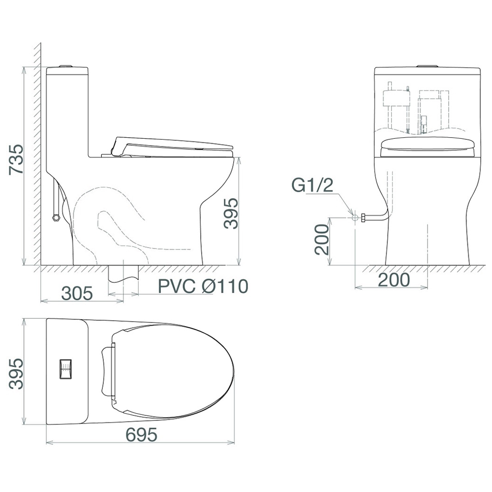 Bản vẽ kỹ thuật bồn cầu Viglacera V64 liền khối nắp êm