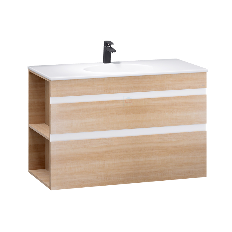 Đặc biệt, hệ thống kệ hở bên hông là một điểm nhấn thông minh, giúp tối ưu hóa diện tích và cho phép bạn dễ dàng lấy các món đồ thường xuyên sử dụng. Sự kết hợp hoàn hảo giữa ngăn kéo kín và kệ mở không chỉ giúp phòng tắm luôn ngăn nắp, sạch sẽ mà còn biến những vật dụng hằng ngày trở thành điểm nhấn trang trí tinh tế.