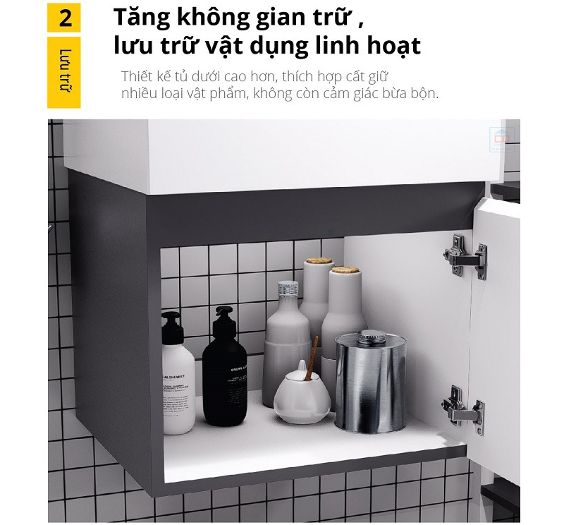 Mặt khác, bộ tủ chậu với thiết kế treo tường giúp không gian phòng tắm trở nên thông thoáng hơn, tạo cảm giác rộng rãi. Đồng thời, phần sàn bên dưới dễ dàng vệ sinh, hạn chế tích tụ bụi bẩn hay ẩm mốc.