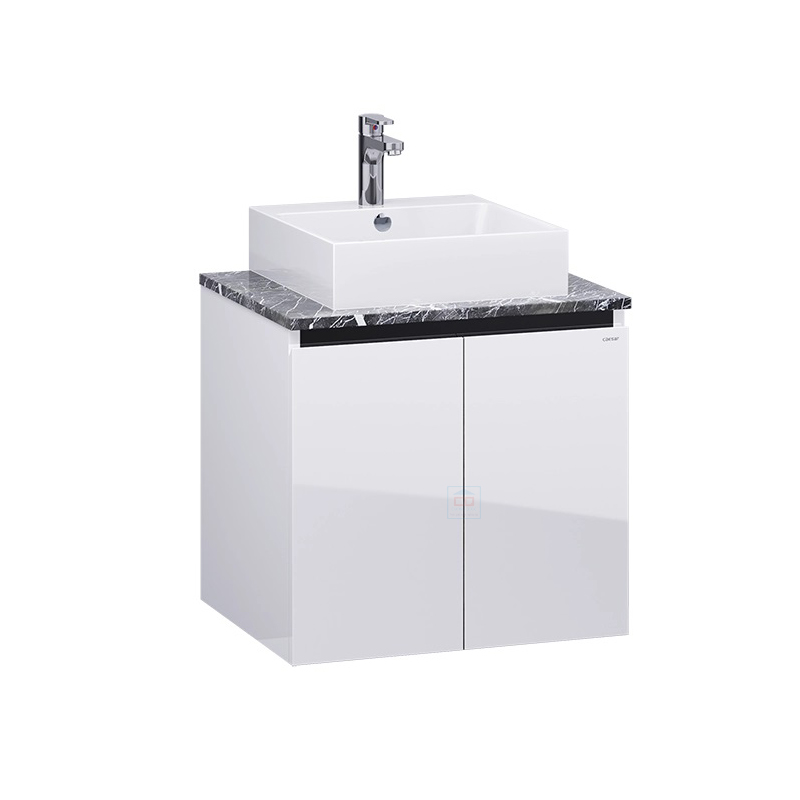 Phần mặt bàn màu đen với những đường vân đá rõ nét giúp tăng vẻ sang trọng. Kết hợp với tủ treo, vừa tạo điểm nhấn tinh tế vừa giúp không gian trông gọn gàng, rộng rãi hơn. Với thiết kế tối giản nhưng cuốn hút, sản phẩm mang đến vẻ đẹp tiện nghi và đẳng cấp cho phòng tắm.