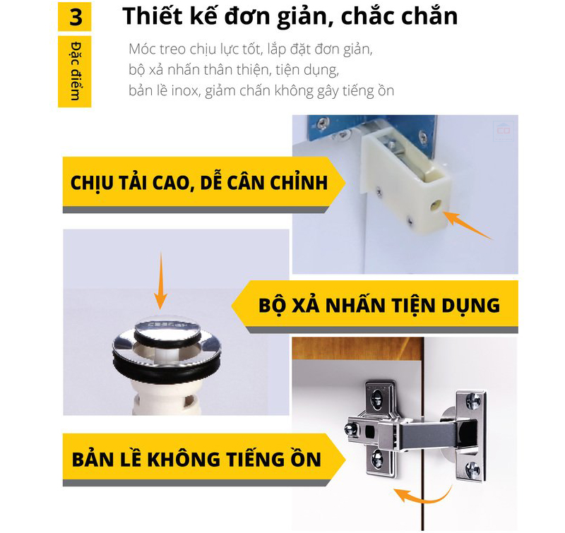 - Bản lề inox giảm chấn: Bộ tủ chậu Caesar LF5263 + EH05263AWV trang bị hệ thống bản lề làm từ inox chống gỉ sét, tích hợp công nghệ giảm chấn giúp việc đóng mở cửa tủ trở nên nhẹ nhàng, êm ái và hoàn toàn không gây tiếng ồn.