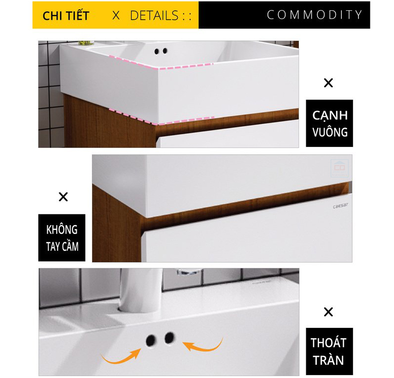 Thiết kế lòng chậu vuông rộng rãi, thành chậu cao vừa phải giúp hạn chế bắn nước ra ngoài trong quá trình sử dụng. Ngoài ra, chậu còn được tích hợp lỗ thoát tràn, hỗ trợ xả nước an toàn, tránh tình trạng nước tràn khi quên khóa vòi.