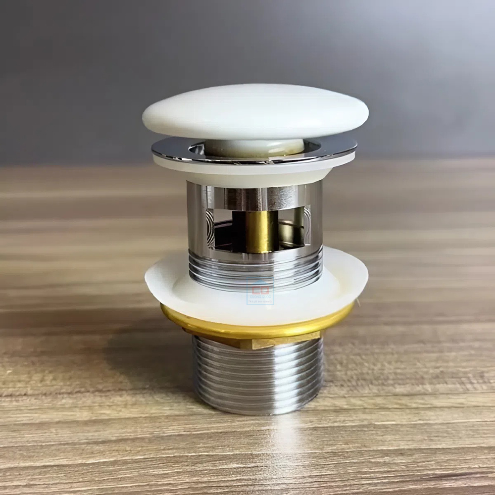 Phần đầu nút nhấn được làm từ chất liệu sứ, tạo nên giá trị thẩm mỹ cao cho sản phẩm. Việc sử dụng chất liệu này không chỉ đảm bảo độ bền bỉ dài lâu, chống chịu tốt với môi trường nước và hóa chất tẩy rửa thông thường, mà còn mang lại vẻ đẹp đồng bộ tuyệt vời với chậu lavabo.