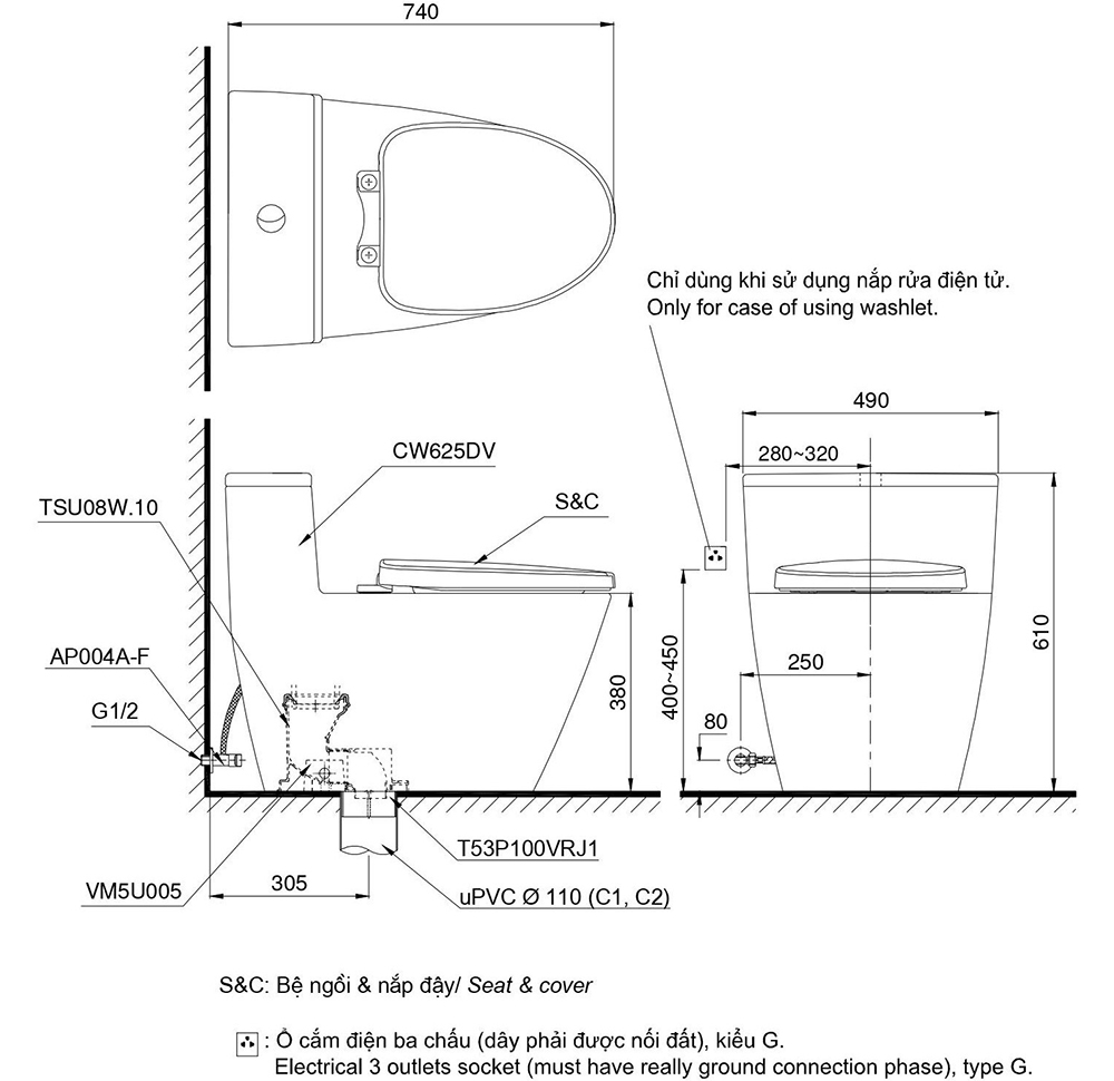 Bản vẽ kỹ thuật bồn cầu nắp điện tử TOTO MS625DW16