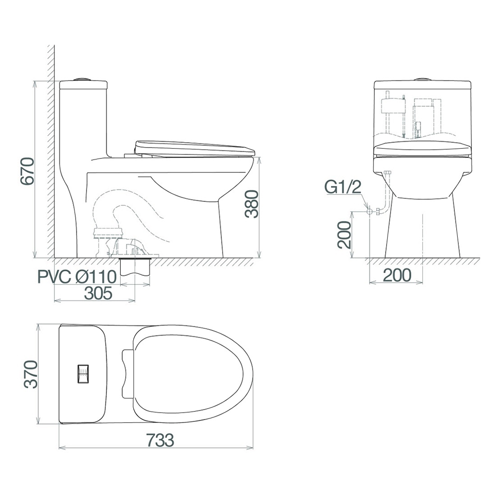Bản vẽ kỹ thuật của bồn cầu liền khối Viglacera Mekong MK2