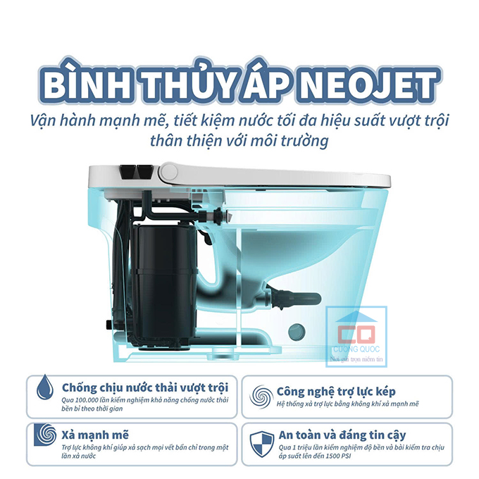 Hệ thống bình thủy áp Neo Jet của bồn cầu chăm sóc NEO-100 vô cùng mạnh mẽ, giúp cuốn trôi chất thải nhanh chóng, đặc biệt là bồn cầu tiết kiệm nước khi sử dụng.
