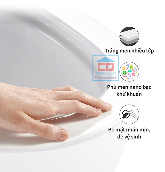 Sản phẩm được làm từ sứ vệ sinh chất lượng cao, phủ lớp men Nano chống bám bẩn, chống ố vàng và dễ lau chùi. Nhờ đó, bồn cầu luôn giữ được vẻ sáng bóng như mới, giảm thiểu thời gian và công sức vệ sinh.