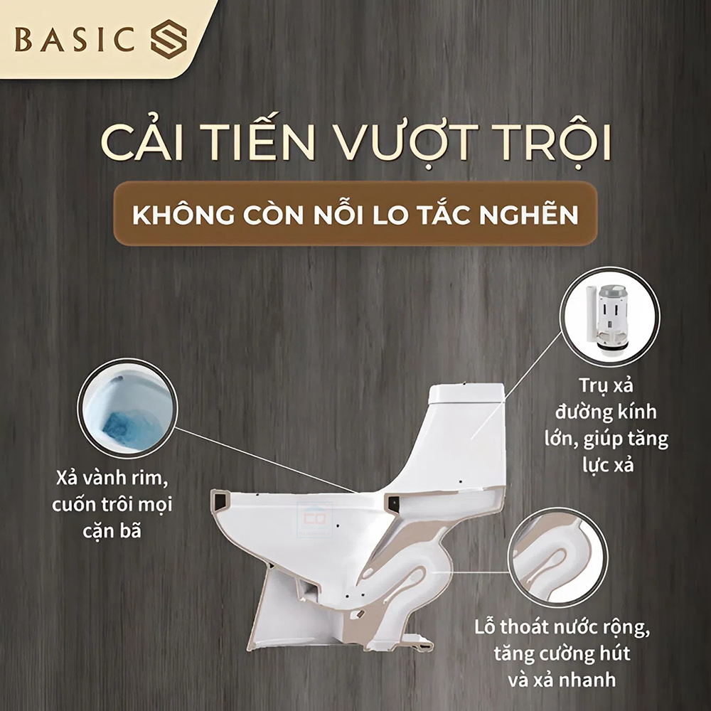Điểm nhấn tiếp theo nằm ở công nghệ xả nước tiên tiến. Bồn cầu Basic BSA-125 được ứng dụng công nghệ xả vành rim hiện đại, mang đến trải nghiệm vượt trội cho người dùng. Hệ thống xả này tạo ra dòng nước mạnh mẽ, len lỏi khắp bề mặt lòng bàn cầu, giúp cuốn trôi mọi vết bẩn nhanh chóng và hiệu quả. Điểm nổi bật là khả năng vận hành êm ái, hạn chế tiếng ồn tối đa, mang lại cảm giác thoải mái trong quá trình sử dụng.