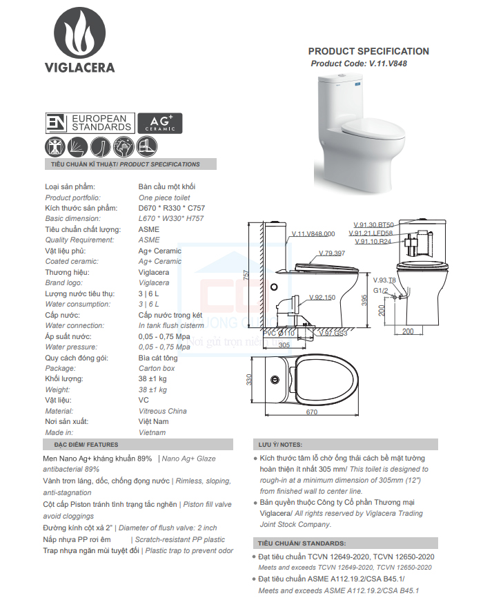 Với những ưu điểm trên, bàn cầu Viglacera V848 không chỉ đạt tiêu chuẩn chất lượng của Việt Nam (TCVN 12649-2020, TCVN 12650-2020), mà còn đạt tiêu chuẩn ASME của Hoa Kỳ (A112.19.2/CSA B45.1), cũng như đạt tiêu chuẩn kỹ thuật được phê chuẩn bởi 3 tổ chức tiêu chuẩn của Châu Âu.