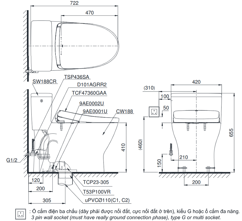 Bản vẽ kỹ thuật bồn cầu TOTO MS188VKW23/T53P100VR