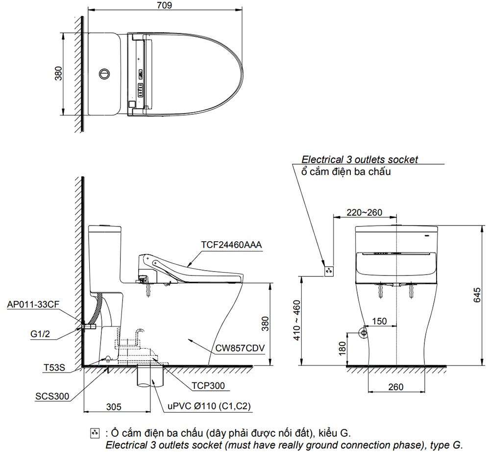 Bản vẽ kỹ thuật bồn cầu nắp điện tử TOTO MS857CDW15