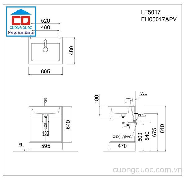 Bản vẽ kỹ thuật tủ EH05017AV + chậu LF5017