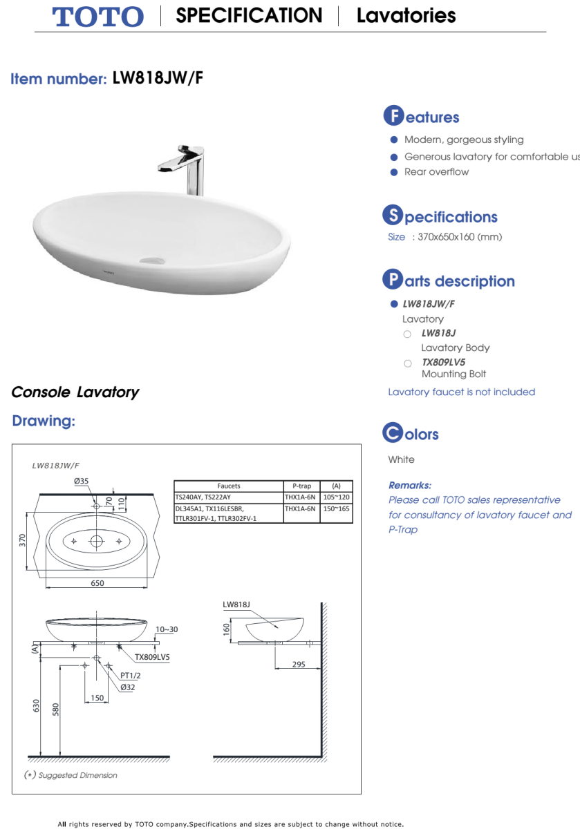 Tên sản phẩm: Chậu rửa lavabo đặt bàn TOTO LW818JW/F#W