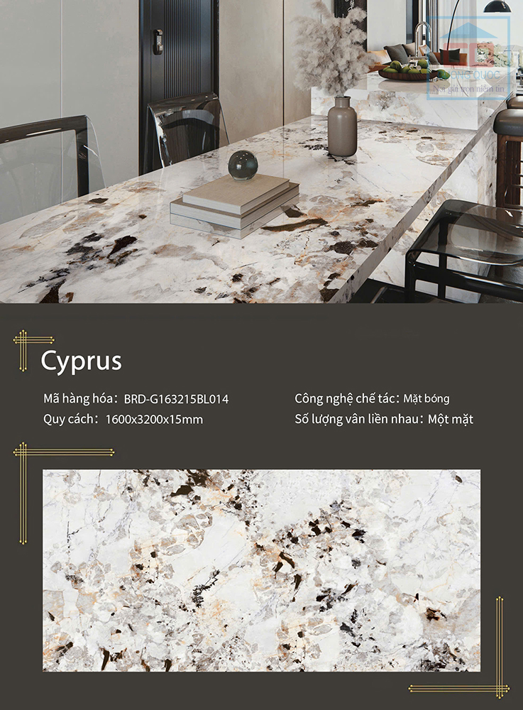 Là một trong những sản phẩm thuộc thương hiệu Boride, đá nung kết BRD-G163215BL014 với tên gọi Cyprus không chỉ là một vật liệu trang trí, mà còn là một giải pháp hoàn hảo cho những không gian cần sự bền bỉ.