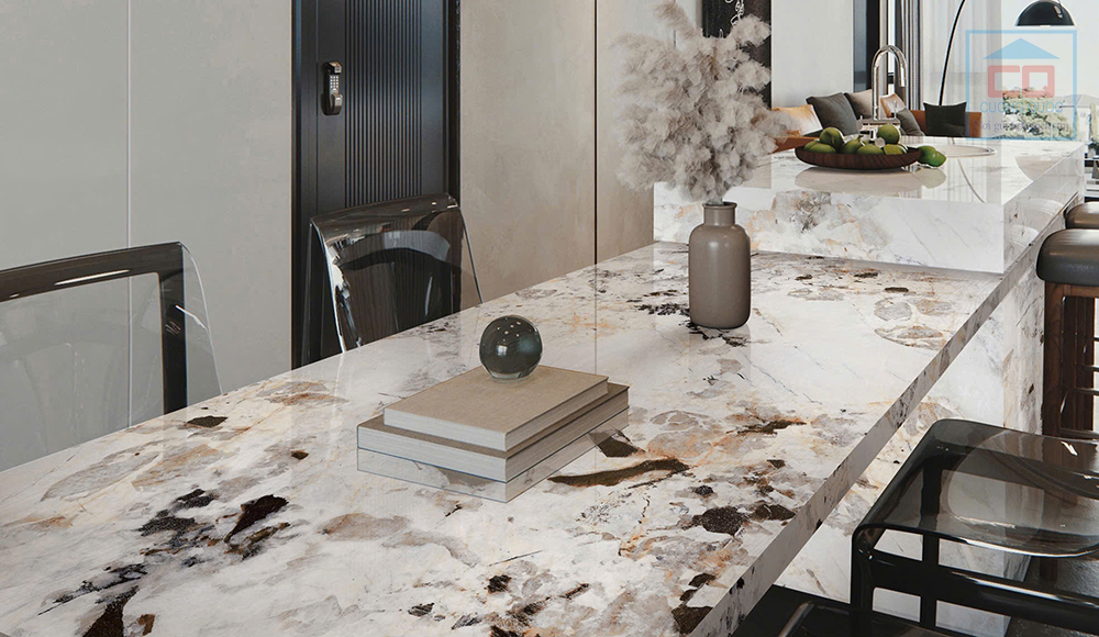 Đặc biệt, mẫu đá này có độ dày lên tới 15 mm góp phần đem lại độ cứng chắc hơn cho sản phẩm, vượt xa các loại gạch ốp lát thông thường.
