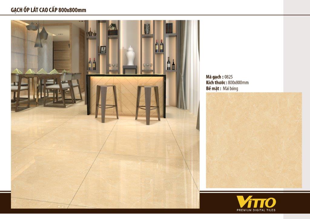 Gạch lát nền Vitto 825 bề mặt phẳng - bóng, xương gạch porcelain, kích thước 800x800 mm, tông mầu vàngg chủ đạo được làm từ những nguyên liệu chất lượng tốt nhất và công nghệ hiện đại nhất, được đảm bảo những tiêu chuẩn về chất lượng quốc tế. Gạch Vitto 825 loại gạch kích thước lớn phù hợp lát nền phòng khách, lát nền phòng ngủ, lát nền bếp, lát nền văn phòng, sảnh lớn...cho các tòa nhà, chung cư, căn hộ, trung tâm thương mại...