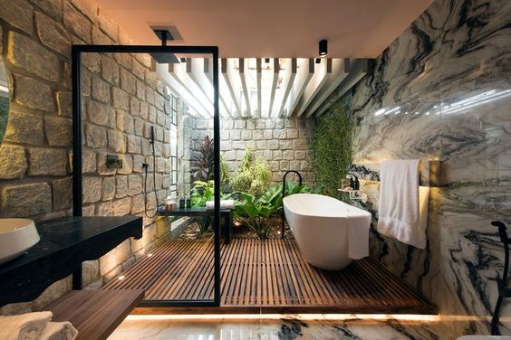 Đây là xu hướng thiết kế phòng tắm đang được nhiều người ưa chuộng, đặc biệt là trong các căn biệt thự hay resort. Phòng tắm với không gian mở có nghĩa là phòng tắm được bố trí sao cho có thể tiếp xúc trực tiếp với thiên nhiên bên ngoài, thông qua các cửa sổ, cửa kính, ban công hay sân thượng. Phòng tắm với không gian mở mang lại nhiều lợi ích cho người sử dụng, như: