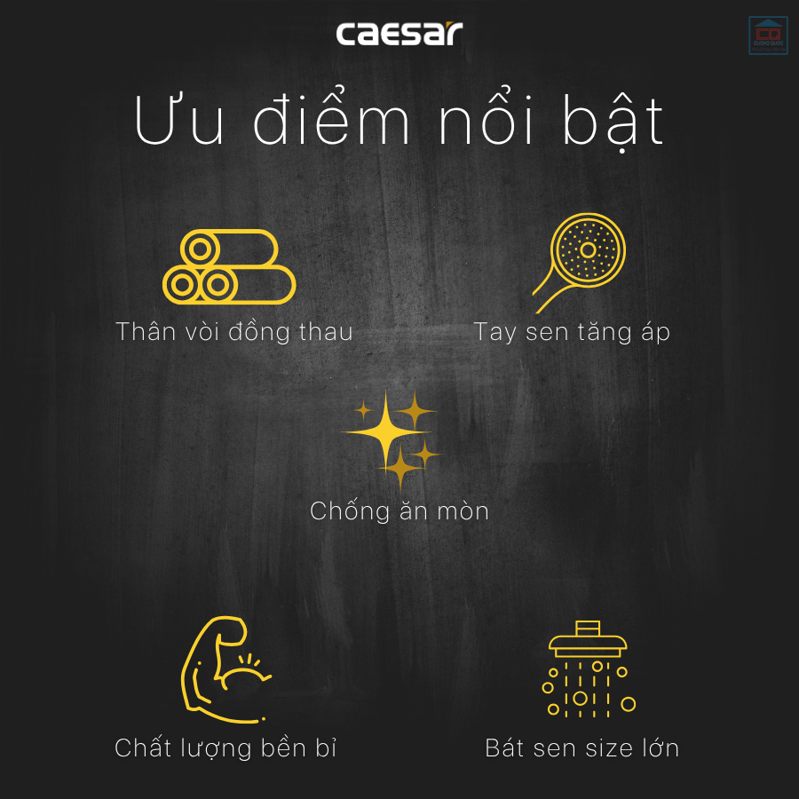 Về chất liệu, thân vòi sen tắm Caesar BS659 được đúc từ đồng thau tuyển chọn. Đây là chất liệu có khả năng chống ăn mòn và oxy hóa cực tốt, đảm bảo an toàn cho nguồn nước và sức khỏe người dùng.