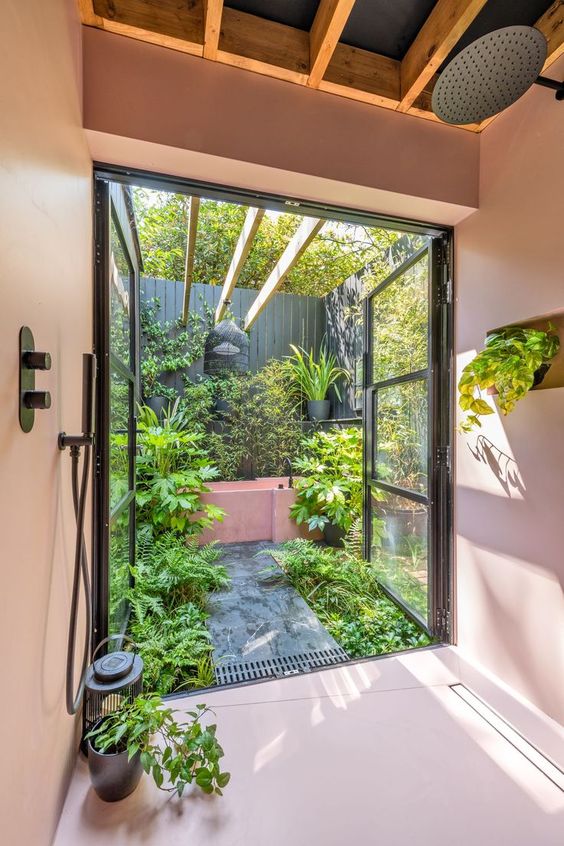 Phòng tắm với không gian mở sân vườn