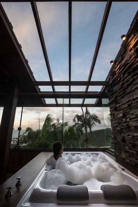 Thiết kế phòng tắm này chủ yếu được lấy ánh sáng, không gian tự nhiên bên ngoài với tầm nhìn hướng ngoại giúp trải nghiệm thư giãn với tự nhiên.