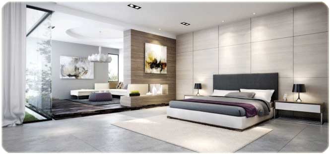 Sử dụng gạch granite lát sàn, gạch giả gỗ với 2 tông màu đậm nhạt trong không gian phòng ngủ, đơn giản - hiện đại